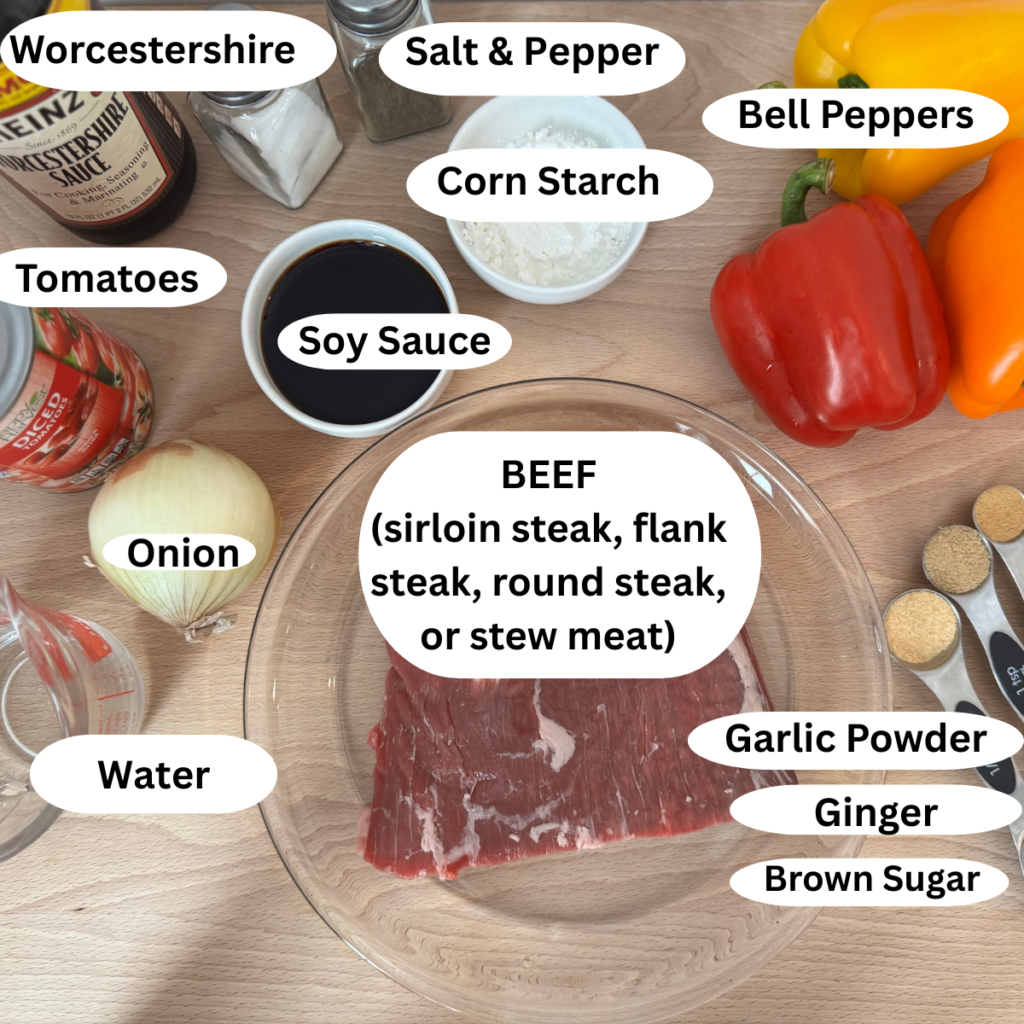 - Add beef, tomatoes, onions, bell peppers, ginger and red pepper flakes (optional) to slow cooker. Whisk soy sauce, Worcestershire, brown sugar, and cornstarch in a small bowl. Pour over hte beef and vegetables.